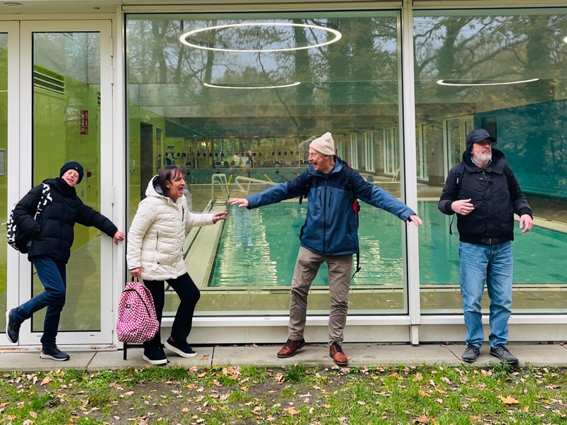 Het groepje van Tinne maakte bij aankomst een wandeling rond het zwembad. Daarna hebben Thijs, Johan, Dirk DC, Dirk D, Eva, Fabienne en Lieve baantjes gezwommen! In het oefenbad gooiden we met Valentino een luchtbal naar elkaar. Dat vonden Kristien en Frederik leuk. Marijke vond het water van het oefenbad lekker warm.