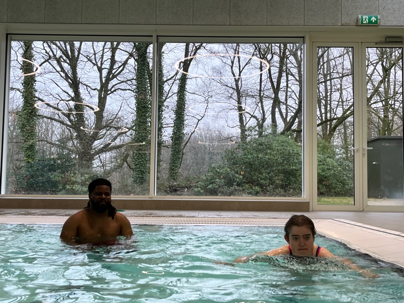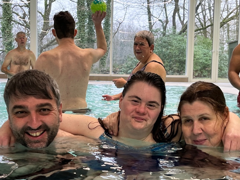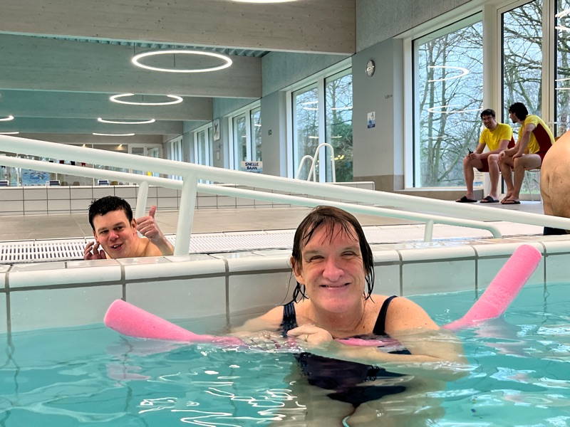 Gisteren zijn we met een grote groep gaan zwemmen. Hier sta ik op de foto samen met mijn vrienden Kristoff en Serena. Ik heb baantjes gezwommen tijdens onze sportieve namiddag.